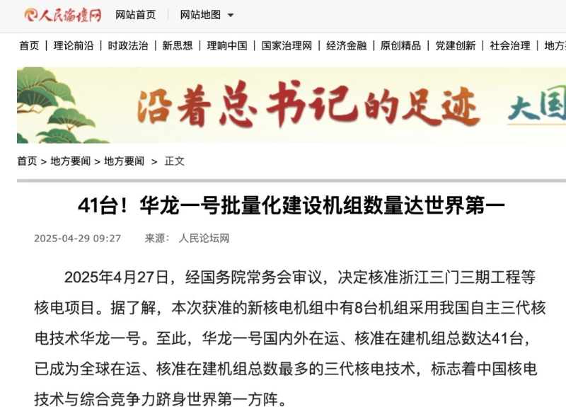 近日,經(jīng)國務院常務會審議,決定核準浙江三門三期工程等核電項目。其中,有8臺機組采用我國自主三代核電技術華龍一號。至此,華龍一號國內(nèi)外在運、核準在建機組總數(shù)達41臺,已成為全球在運、核準在建機組總數(shù)最多的三代核電技術。